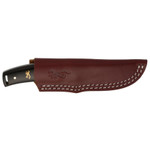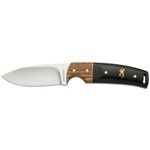 The Buckmark hunter is a sturdy drop point with the Browning Buckmark embellished on the two-tone hardwood handle. This knife has durable brass pins in the handle and comes with a leather belt sheath.