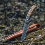 Elegant and functional 4-1/2" trailing point blade. This is a fixed blade with an overall length of 9". Dark black oxide stonewashed finish. Full tang construction. Anti-skid grooves on the blade spine. Stitched leather belt sheath.