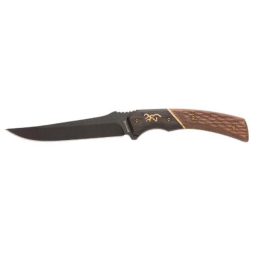 Sharp in more ways than one. This fixed blade hunting knife with a strong trailing point profile is ideal for everything from boning out an elk right down to slicing steaks for dinner. Browning's new Hunter Series knives are long on quality and performance. They are a fusion of modern looks with classic materials like 440C stainless steel blades, traditional polished hardwood handles with jigged patterns and polished brass accents.
