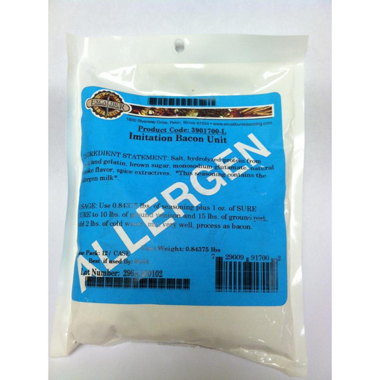 Usage: Use 0.84375 lbs. of seasoning plus 1 oz. os SURE CURE to 10 lbs. of ground vension and 15 lbs. of ground pork. Add 2 lbs. of cold water, mix very well, process as bacon.