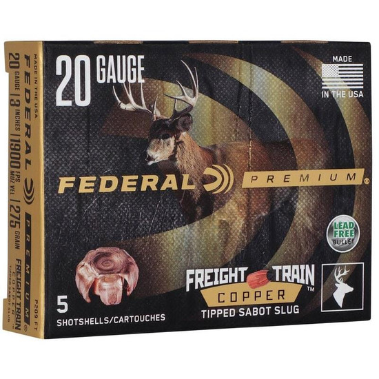 Slug accuracy and power are thundering down the tracks with the Federal Premium® FreightTrain™ copper sabot. The load's streamlined copper projectile and exclusive sabot design team up to print groups of less than 4 inches at 200 yards through rifled barrels. A polymer tip and aerodynamic nose profile maximize downrange energy, while the externally skived nose cavity provides dramatic expansion to drop buck, bears or boars where they stand.