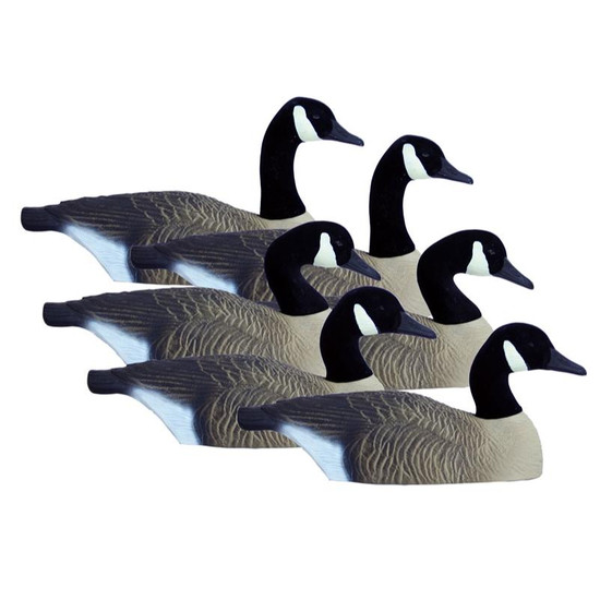 Give geese the ultimate confidence when flying over your field spread. You'll love the convenience, diversity and good looks of this heavy duty, field shell goose. These field shells can stack onto each other allowing you to carry several dozen into the field with ease. They were designed with awesome feather detail by an award winning, professional wildlife carver. The natural paint tones and realistic feather detail on these shells is unmatched. Higdon's highly detailed, proprietary UV painting process and deep realistic carving techniques highlight each individual feather and minimize unnatural glare. Our paint won't peel or fade, so your decoys will look great season after season. They are lightweight and stackable, easy to set up. All Canada models come with field tested, durable black flocked heads with white painted cheek patches. This field shell offers unmatched portability and realism. Package includes 6 decoy shells. Flocked head positions include 1 Tru Sentry, 1 Rester, 2 Tru Walkers, 2 Feeders.