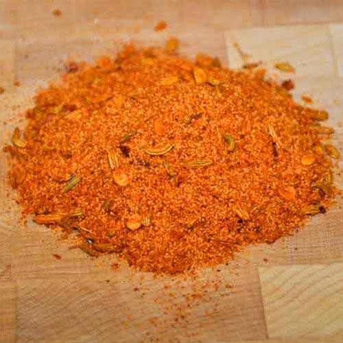 Ingredients: Salt, Spices (Including Fennel, Pepper, Anise), Paprika, Monosodium Glutamate, Dextrose, Garlic Powder, BHT (0.70%), Natural Spice Extractives.