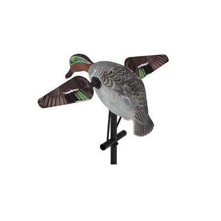 Full size decoy, Remote ready (not included), Durable plastic wings with magnetic connection, 3-piece 42" stake. Runs on 4 AA batteries (not included). Wing design extends battery life 12-16 hours!