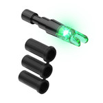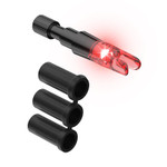 Simplicity, strength, and functionality were the driving force in the Contender LED lighted nock design for bows. By eliminating the practice collar, we created a sleek low-profile design. The Contender for bows includes the same universal fit bushings featured in our original design with one exception -- to maintain the low-profile design, fitting a micro diameter arrow shaft just wasn't possible. The Contenders fit X, H, S/GT with the included black bushings.