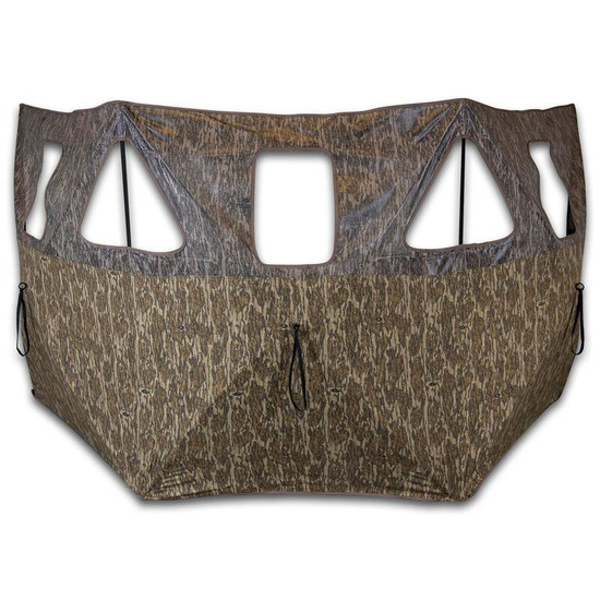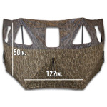Thousands of very small holes dot the fabric. On the outside, the camo print and natural light force human and animal eyes to focus on the camo, making the holes "invisible." On the inside the black print and darkened interior allow your eyes to focus through the holes for a clear view of the outside
