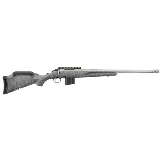 The Ruger American Predator Gen II bolt is CNC machined from stainless steel for smooth operation and the familiar three-lug design with a 70 degree throw provides ample scope clearance. Features a splatter finished stock that provides excellent grip without being too sharp or abrasive; installed spacer allows for length of pull to be adjusted; low comb improves sight alignment when using optics; medium contour, spiral, threaded barrel; factory-installed radial port muzzle brake; 3-position tang safety; Ruger Marksman Adjustable trigger and Picatinny rail. Includes one magazine and steel sling swivel studs.