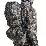 Low-profile efficiency for the minimalist hunter in a hip pack with a removable Sitka Gear jacket and bib shoulder harness system.