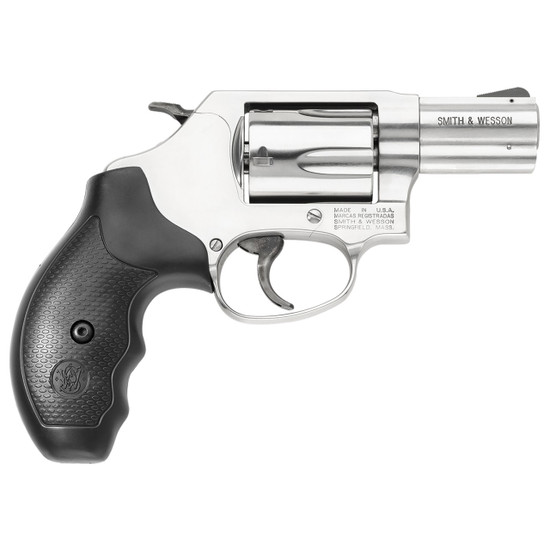 Small J-frame size. Single/double action. Exposed hammer. Black blade front sight, adjustable rear sight. Five round capacity. Synthetic grip. Stainless steel frame and stainless steel cylinder. Satin stainless finish.
