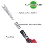 The Alpha-Blaze Lighted Nock contains a one-piece Nock/LED unit that is indexed with the vanes and press fits into the arrow's Aluminum Bushing. Upon firing the crossbow, the bowstring's force compresses the two pieces and activates the lighted nock.