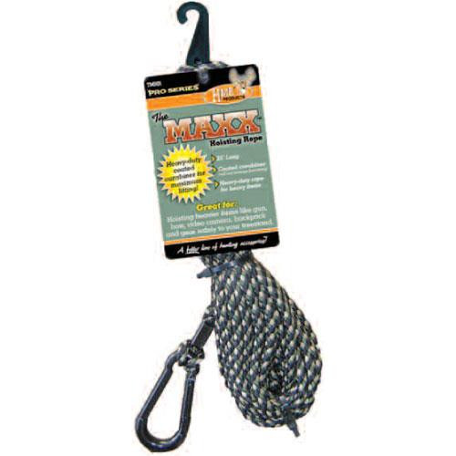 We offer the largest line of lift cords on the market. From our economy version to the PRO SERIES adjustable length versions and now…The MAXX™ Hoisting Rope. We consider The MAXX™ to be the best lift cord on the market. Its 25 foot length is long enough to fit most hunters’ needs. Its most important feature is the heavy-duty metal carabiner hook. The carabiner hook has had the hang area dipped in PVC to prevent damaging your bow string or the finish on your weapon. We have a double-loop attachment of the carabiner to the cord along with a double clasp for added strength. Great for lifting heavier items like your gun, bow, back pack, etc.