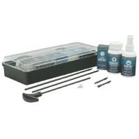 Kits contain 2.25oz. Ultra-Lube; 2oz. Ultra-Klenz, blackened steel rod with “soft grip” handle, muzzle guard, phosophor brushes, wool mops, cotton patches and cleaning tips and jags. All this stores in a reusable storge box.