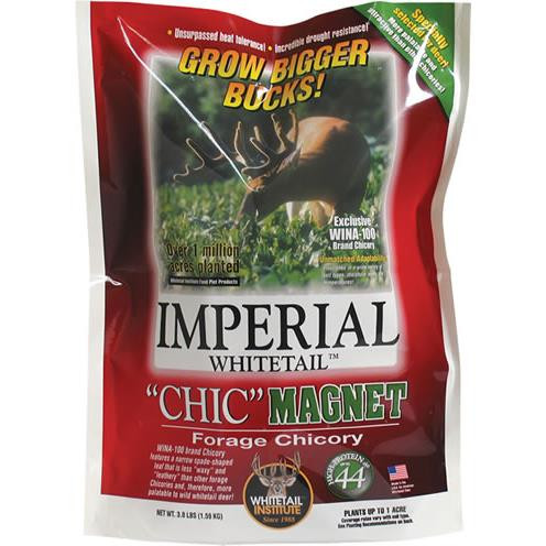 When you want a perennial, drought-resistant, attractive forage with incredible drawing power, look no further than Imperial Whitetail “Chic” Magnet featuring WINA-100 Forage Chicory, which was developed specifically for whitetail deer. Available as a component of Chicory Plus, Alfa-Rack Plus and Extreme, WINA-100 forage chicory is also packaged separately in Imperial Whitetail “Chic” Magnet. “Chic” Magnet can be planted alone, mixed with other seeds, or over-seeded into existing forages to provide gains in variety, attractiveness and drought-resistance. It’s well-suited for planting in the spring or fall in most areas and lasts up to 3 years from a single planting. Recommended for planting in heavier soils that hold moisture or moderately drained soils, “Chic” Magnet can withstand even extreme summer conditions. The WINA-100 forage chicory in “Chic” Magnet is more tender and less waxy, and deer are extremely attracted to it, showing a preference for the taste over traditional chicory varieties planted in the past. Rely on “Chic” Magnet’s high-protein (up to 44%) forage for maximum deer attraction and antler-growing nutrition.